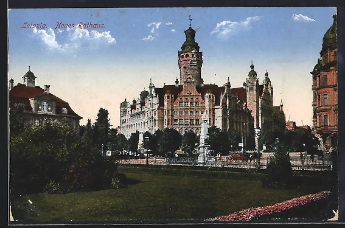 AK Leipzig, Neues Rathaus mit Denkmal und Strassenbahn