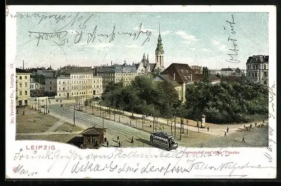 AK Leipzig, Promenade am alten Theater mit Strassenbahn