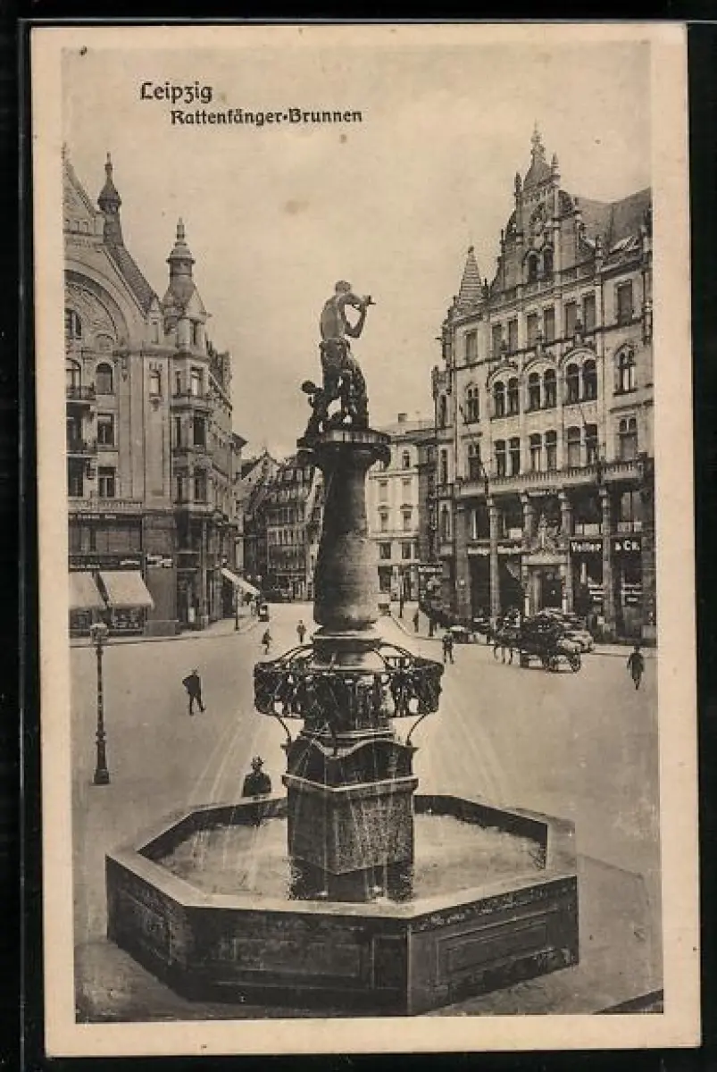 AK Leipzig, Rattenfänger-Brunnen mit Umgebung und Geschäfte