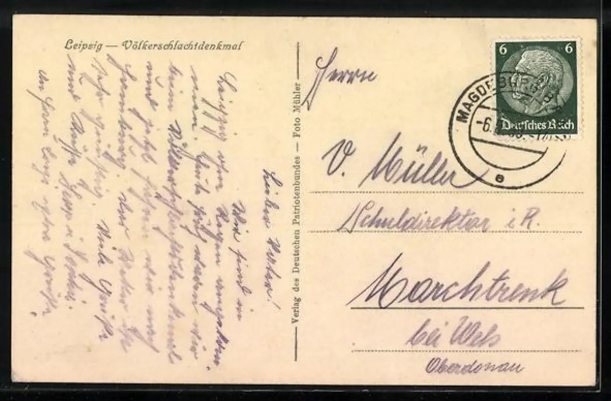 Personenbezogene Daten auf der Rückseite der Karte wurden durch blauen Textmarker unkenntlich gemacht. Die blauen Stellen sind auf die Vorderseite durchgeweicht und wirken sich negativ auf das Postkartenfoto aus