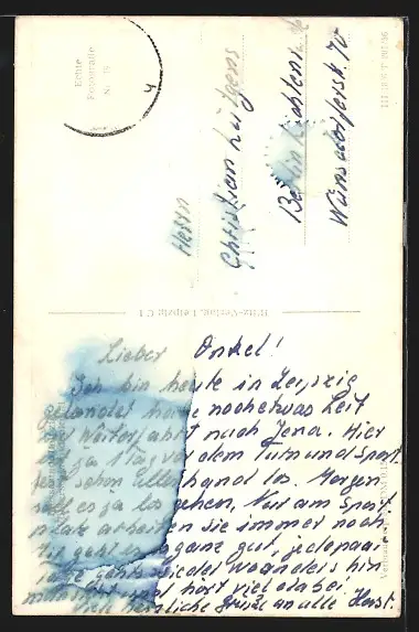 Personenbezogene Daten auf der Rückseite der Karte wurden durch blauen Textmarker unkenntlich gemacht. Die blauen Stellen sind auf die Vorderseite durchgeweicht und wirken sich negativ auf das Postkartenfoto aus