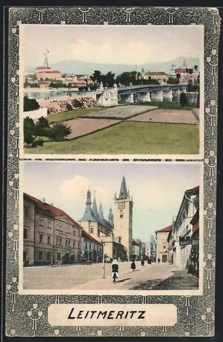 AK Leitmeritz, Flusspartie mit Brücke, Ortspartie