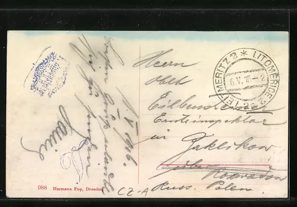 Personenbezogene Daten auf der Rückseite der Karte wurden durch blauen Textmarker unkenntlich gemacht. Die blauen Stellen sind auf die Vorderseite durchgeweicht und wirken sich negativ auf das Postkartenfoto aus