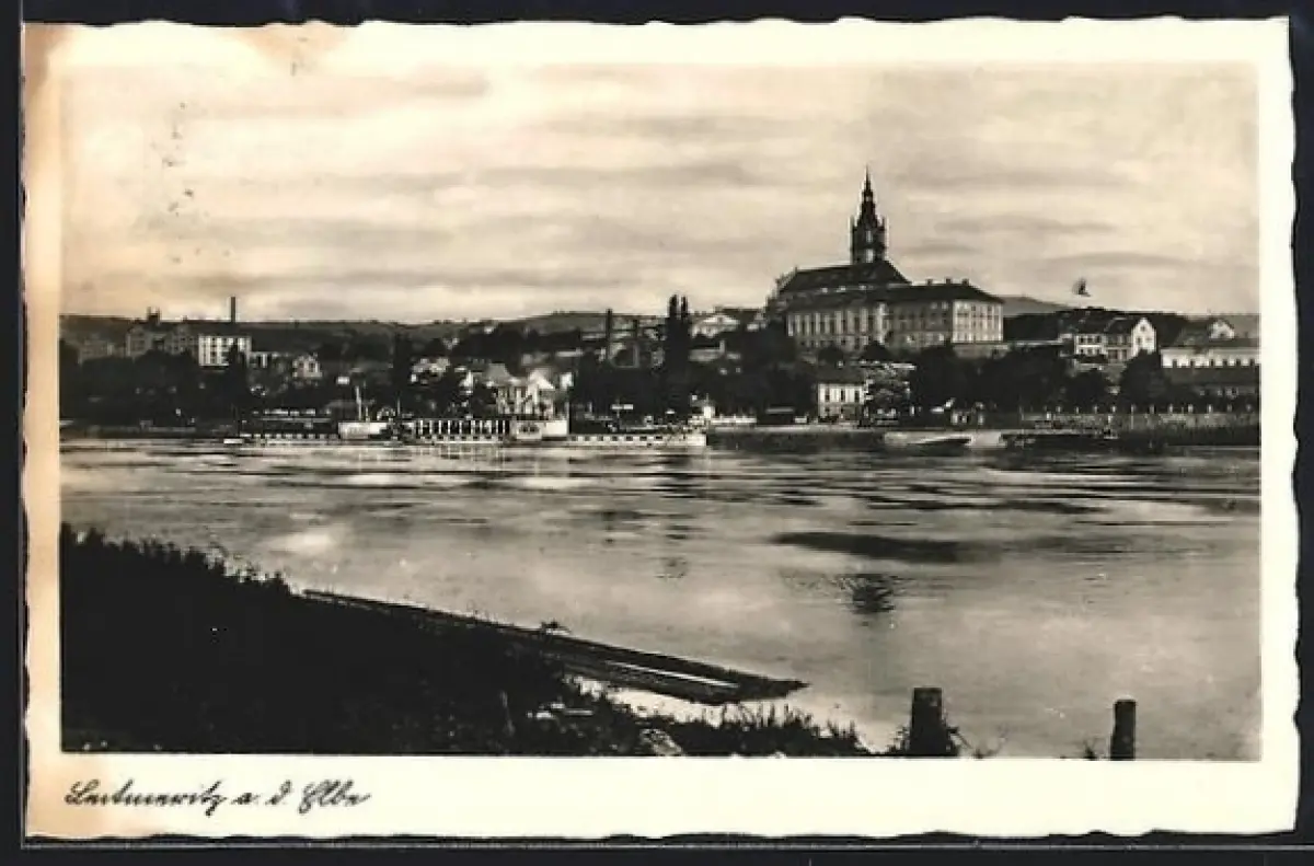 AK Leitmeritz a. d. Elbe, Uferpartie mit Kirche