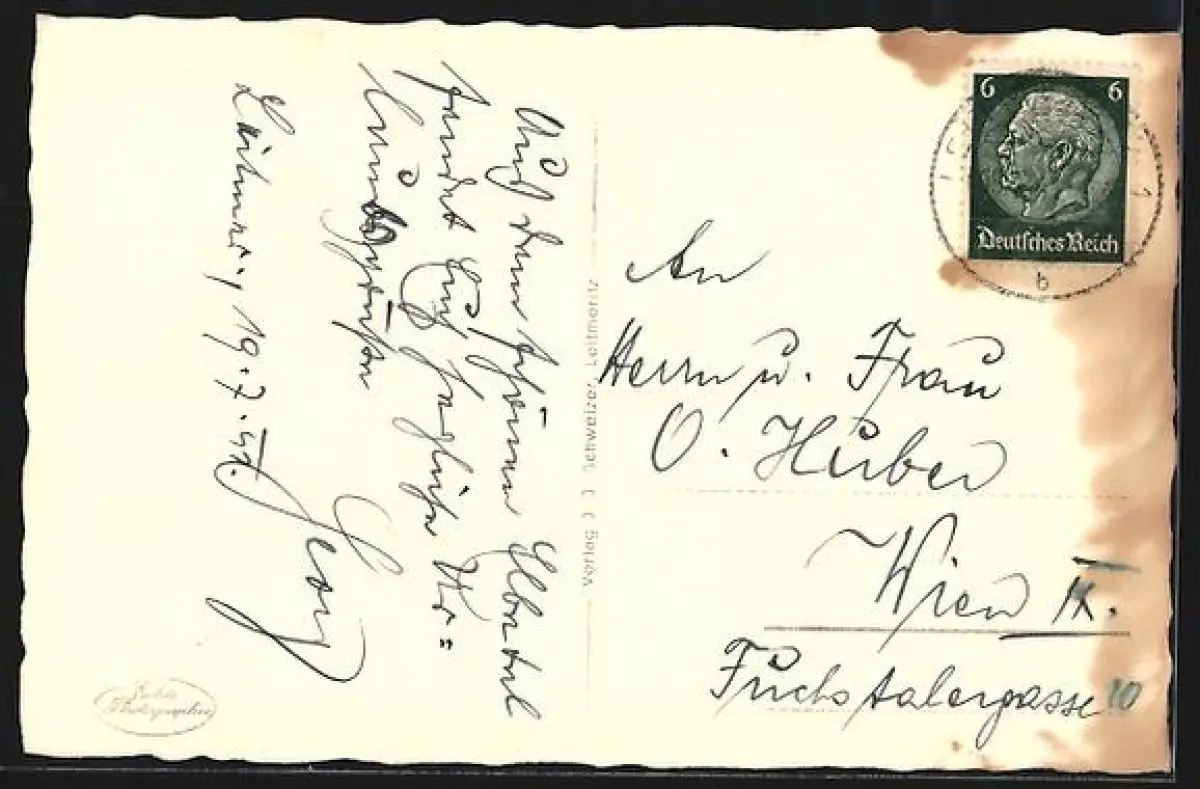 Personenbezogene Daten auf der Rückseite der Karte wurden durch blauen Textmarker unkenntlich gemacht. Die blauen Stellen sind auf die Vorderseite durchgeweicht und wirken sich negativ auf das Postkartenfoto aus