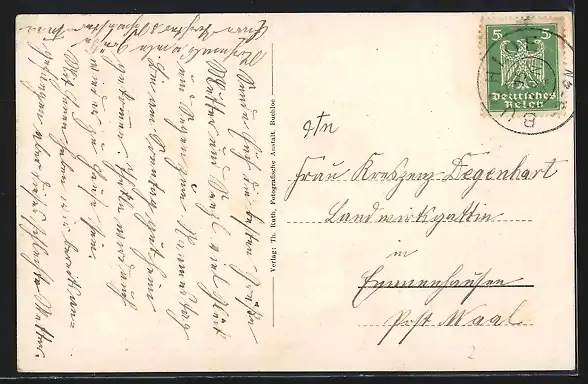 Personenbezogene Daten auf der Rückseite der Karte wurden durch blauen Textmarker unkenntlich gemacht. Die blauen Stellen sind auf die Vorderseite durchgeweicht und wirken sich negativ auf das Postkartenfoto aus