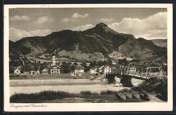 AK Lenggries, Ortsansicht mit Brücke & Kirche, Geierstein im Hintergrund