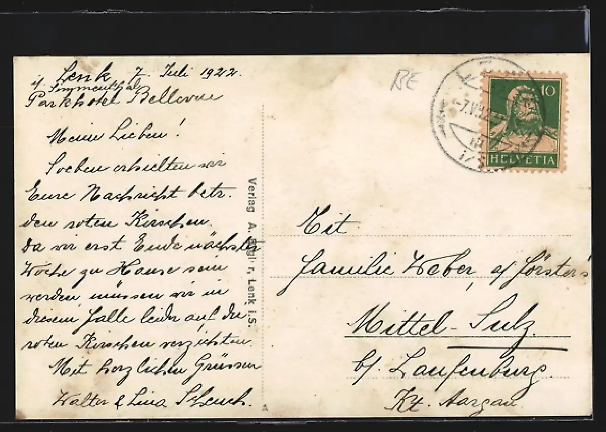 AK Lenk i. S., Ortsansicht mit Bergen von einer Wiese aus