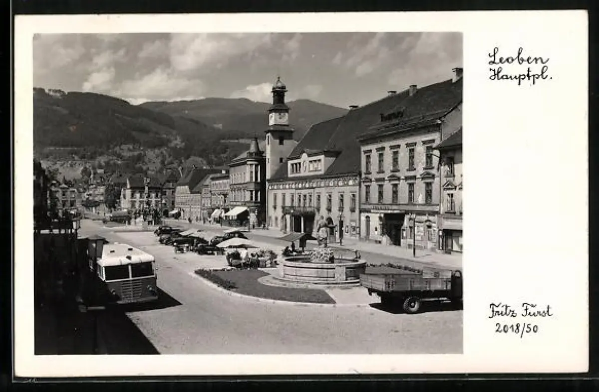 AK Leoben, Hauptplatz mit Brunnen und Autos