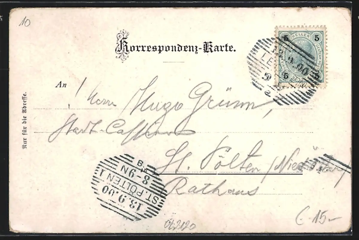 alte Ansichtskarte, gelaufen 1900, Eckknick links oben, min. Einriss obere Kante, Bugspur unten mittig