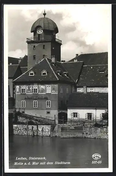 AK Leoben /Steiermark, Motiv a. d. Mur mit Stadtturm