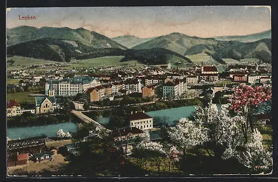 AK Leoben, Teilansicht mit Bäumen in Frühlingsblüte