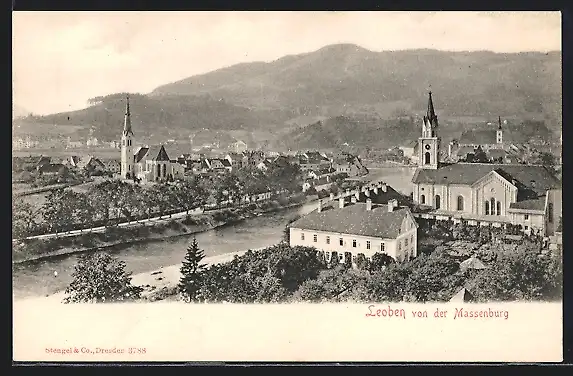 AK Leoben, Teilansicht mit Kirche von der Massenburg