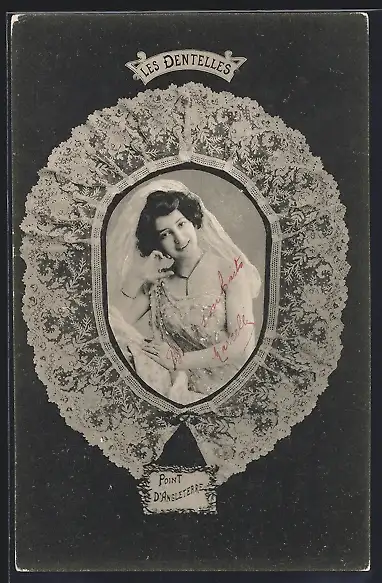 AK Les Dentelles, Point D`Angleterre, Portrait einer Frau in Spitzenrahmen