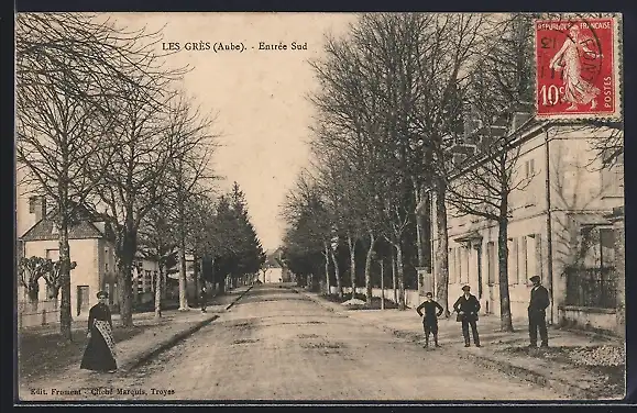 AK Les Grès, Entrée sud avec arbres et passants sur la route principale