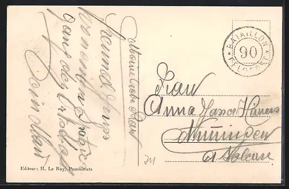 Personenbezogene Daten auf der Rückseite der Karte wurden durch blauen Textmarker unkenntlich gemacht. Die blauen Stellen sind auf die Vorderseite durchgeweicht und wirken sich negativ auf das Postkartenfoto aus