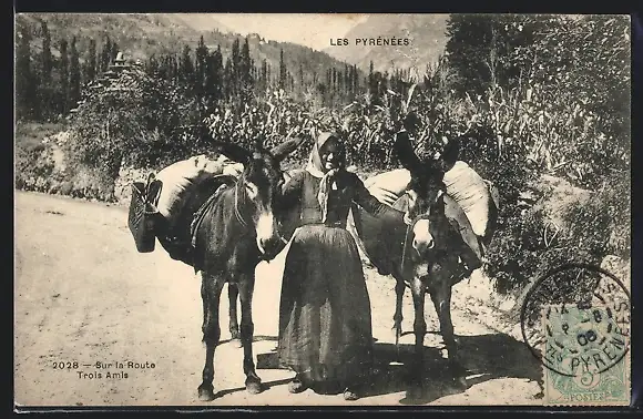 AK Les Pyrénées, Sur la Route - Trois Amis, Magd mit Packeseln