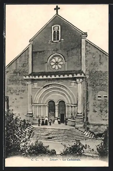 AK Lescar, la Cathédrale, vue frontale avec quelques personnes sur le perron