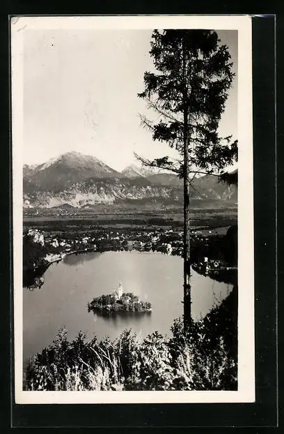 AK Letovisce Bled, Panoramablick mit der Insel und dem Gebirge dahinter