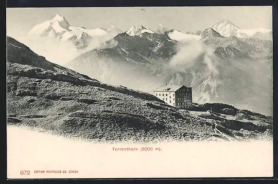 AK Leukerbad, Torrenthorn, Gasthaus vor verschneiten Gipfeln