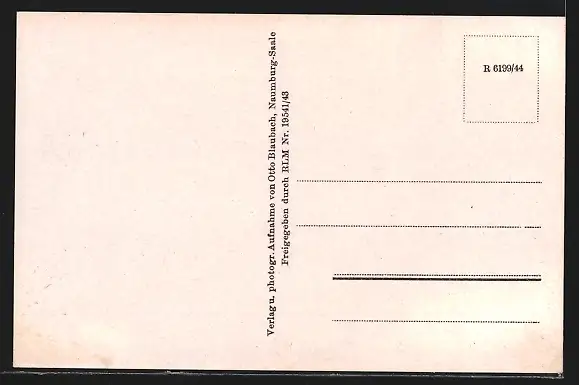 Personenbezogene Daten auf der Rückseite der Karte wurden durch blauen Textmarker unkenntlich gemacht. Die blauen Stellen sind auf die Vorderseite durchgeweicht und wirken sich negativ auf das Postkartenfoto aus