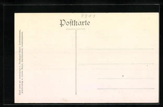 Personenbezogene Daten auf der Rückseite der Karte wurden durch blauen Textmarker unkenntlich gemacht. Die blauen Stellen sind auf die Vorderseite durchgeweicht und wirken sich negativ auf das Postkartenfoto aus