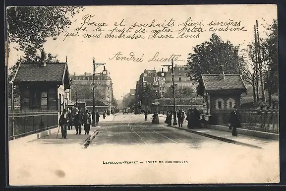 AK Levallois-Perret, Porte de Courcelles avec passants et bâtiments en arrière-plan