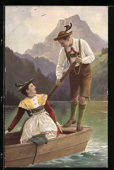 AK Liebespaar im Ruderboot trägt bayrische Trachten