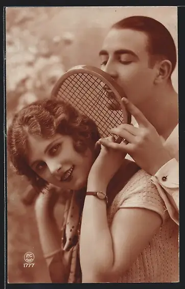 AK Liebespaar mit Tennisschläger in inniger Pose