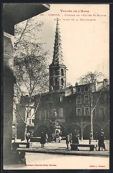 AK Limoux, le clocher de l`église Saint-Martin et la place de la République, des passants
