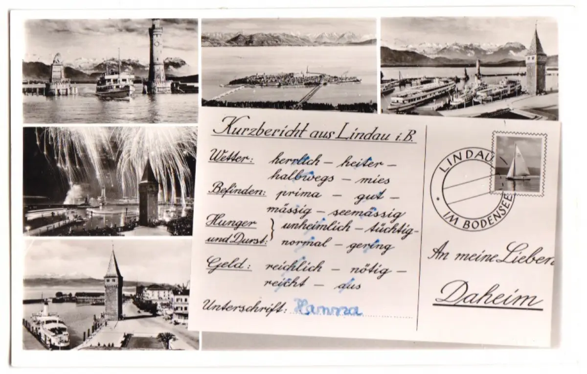 Ansichtskarte Lindau Bodensee Kurzbericht aus Lindau Bodensee, fünf Abb., gestaltet Erhaltung I-II postalisch gelaufen, ungestempelt: um 1958 Verlag: Gebr. Metz, Tübingen