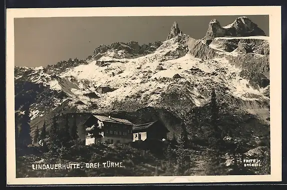 AK Lindauerhütte, Ansicht der Berghütte mit Drei Türme