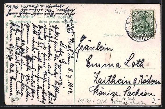 alte Ansichtskarte, gelaufen 1914, Bugspur und Eckknick unten re., guter Zustand