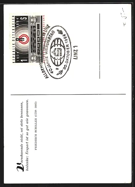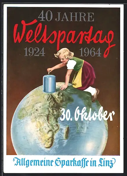 AK Linz, Weltspartag 1964, Allgemeine Sparkasse, Mädchen auf Weltkugel