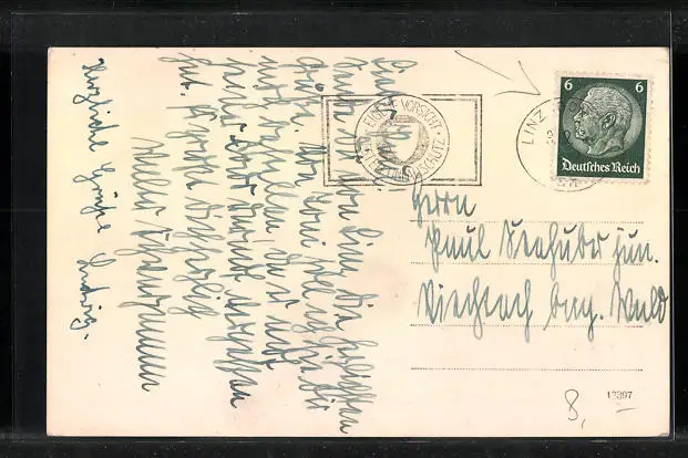 Personenbezogene Daten auf der Rückseite der Karte wurden durch blauen Textmarker unkenntlich gemacht. Die blauen Stellen sind auf die Vorderseite durchgeweicht und wirken sich negativ auf das Postkartenfoto aus