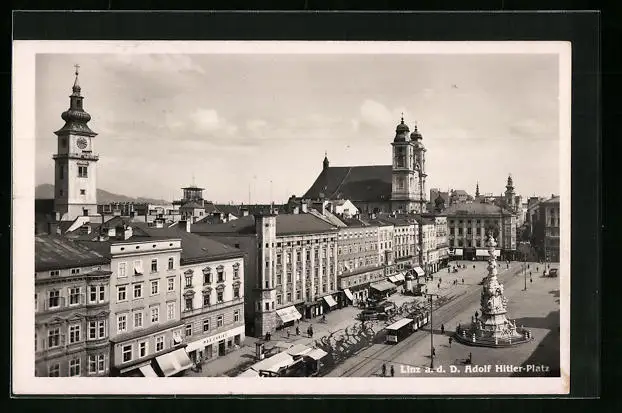 AK Linz a. d. D., Platz mit Geschäften und Denkmal, Strassenbahn