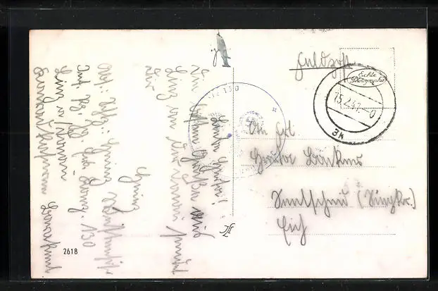 Personenbezogene Daten auf der Rückseite der Karte wurden durch blauen Textmarker unkenntlich gemacht. Die blauen Stellen sind auf die Vorderseite durchgeweicht und wirken sich negativ auf das Postkartenfoto aus