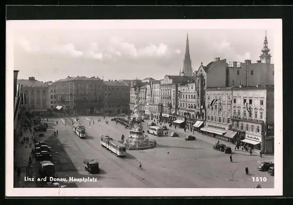 AK Linz a. d. Donau, Hauptplatz mit Geschäften und Denkmal, Strassenbahn