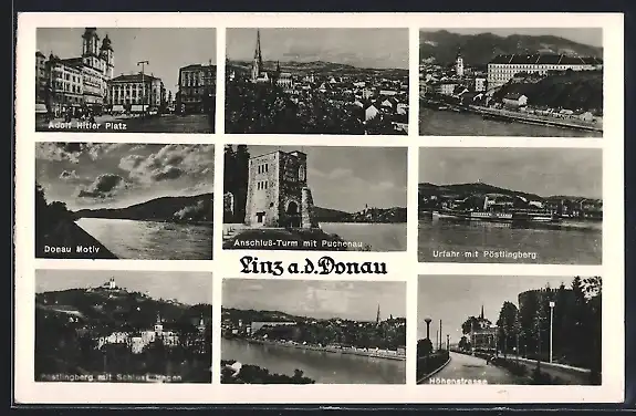 AK Linz a. d. Donau, Platz, Höhenstrasse, Urfahr mit Pöstlingberg, Anschluss-Turm mit Puchenau