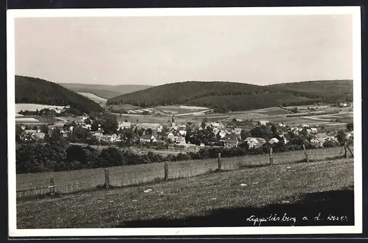 AK Lippoldsberg a. d. Weser, Ortsansicht mit Kirche und Gebirge