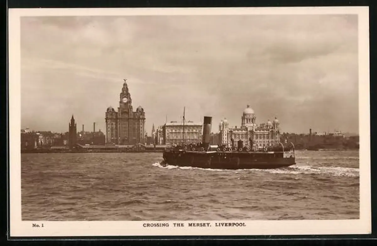 AK Liverpool, Crossing the Mersey, Ferry boat approaching The Royal Liver Building