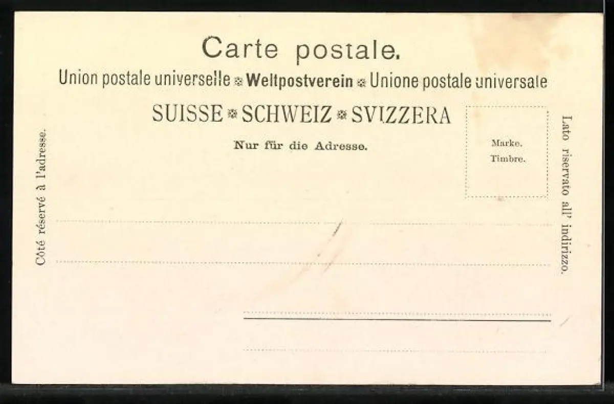 Personenbezogene Daten auf der Rückseite der Karte wurden durch blauen Textmarker unkenntlich gemacht. Die blauen Stellen sind auf die Vorderseite durchgeweicht und wirken sich negativ auf das Postkartenfoto aus