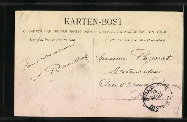 Personenbezogene Daten auf der Rückseite der Karte wurden durch blauen Textmarker unkenntlich gemacht. Die blauen Stellen sind auf die Vorderseite durchgeweicht und wirken sich negativ auf das Postkartenfoto aus