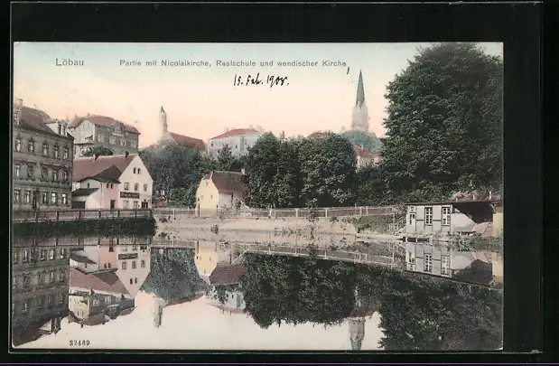 AK Löbau /Sa., Partie mit Nicolaikirche, Realschule und wendischer Kirche