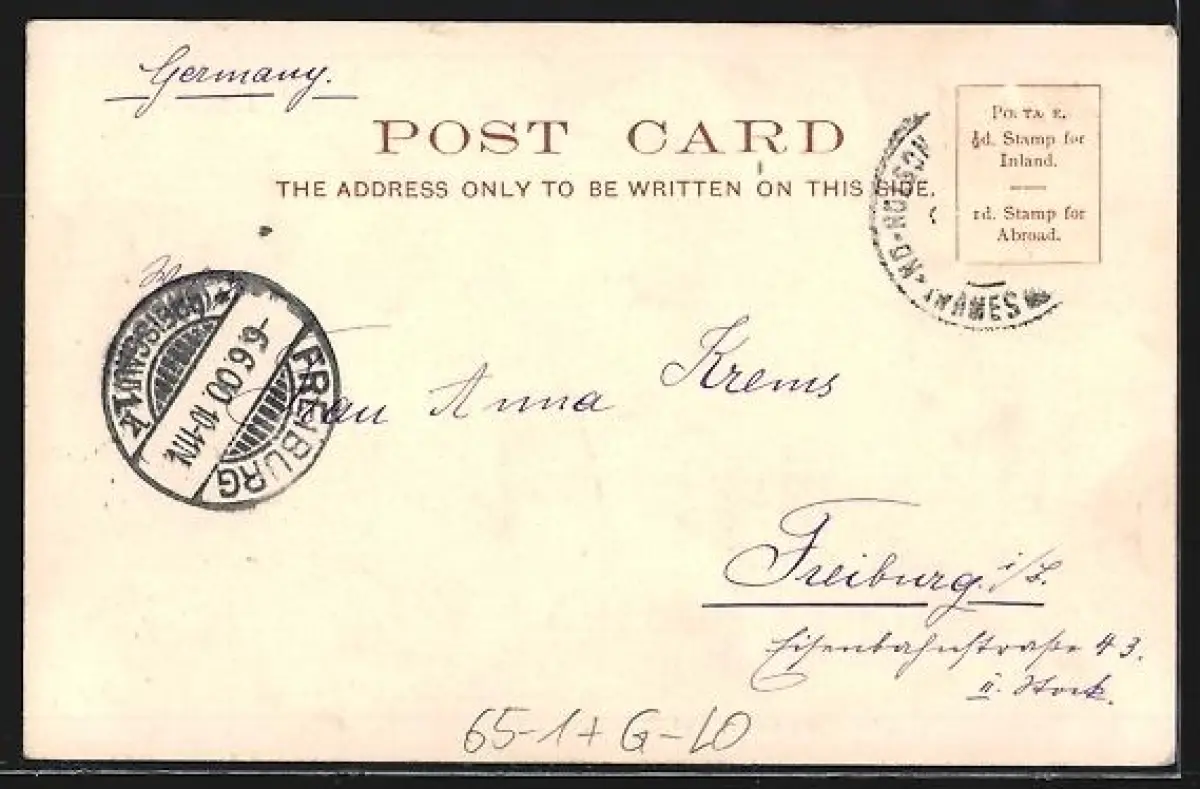 gelaufen 1900, Briefmarke entfernt, guter Zustand