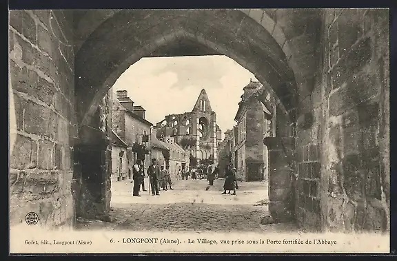 AK Longpont, Le Village, vue prise sous la Porte fortifiée de l`Abbaye