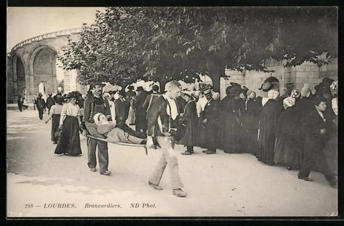 AK Lourdes, Brancardiers portant un malade devant la foule