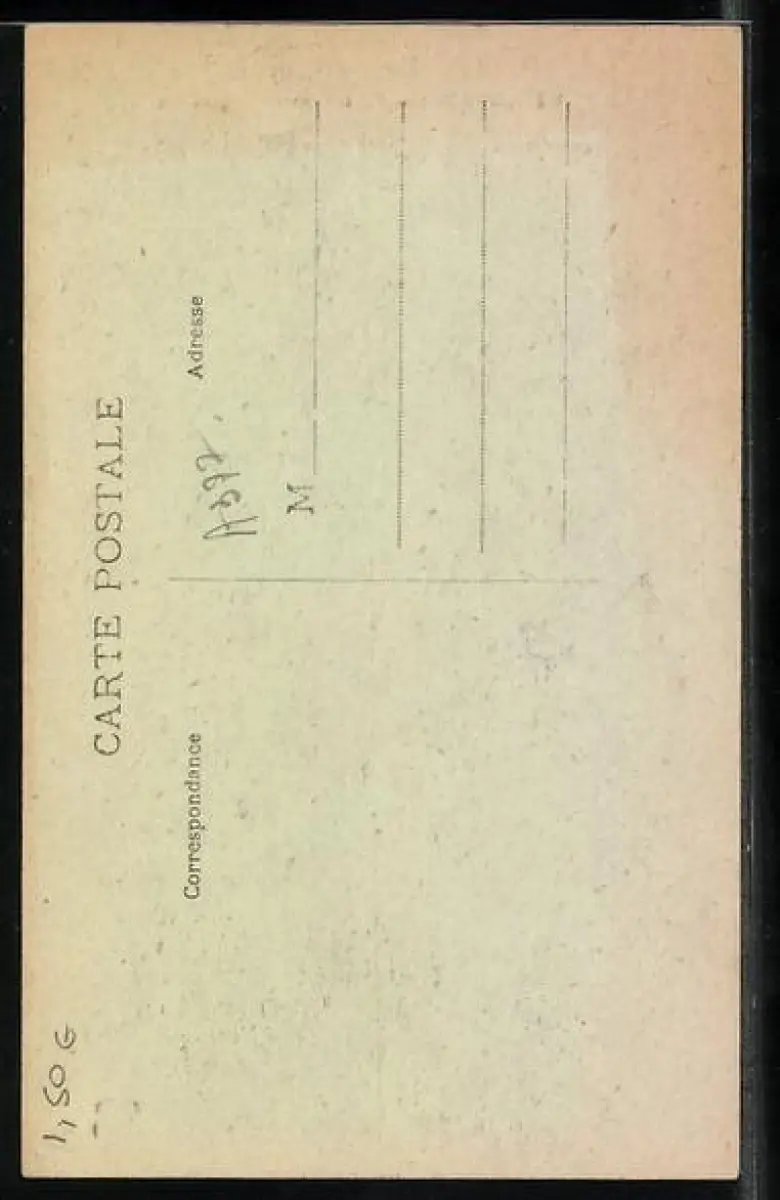 Personenbezogene Daten auf der Rückseite der Karte wurden durch blauen Textmarker unkenntlich gemacht. Die blauen Stellen sind auf die Vorderseite durchgeweicht und wirken sich negativ auf das Postkartenfoto aus