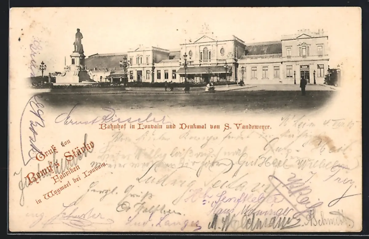 AK Louvain, Bahnhof und Denkmal von S. Vandemeyer