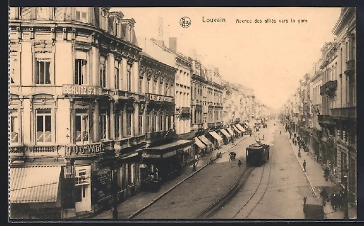 AK Louvain, Rue de la Station vers la gare, Strassenbahn, Häuserfassaden mit Geschäften